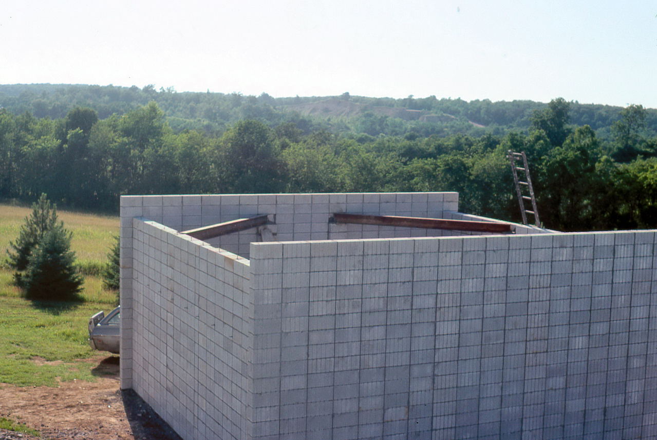 Jun 7 Samolyk, Hanson, Fanson, Asztalos, Hesseltine, Harris, Zit: Laying block. The day started with a very intense thunderstorm that could have canceled the planned day. Jim Fanson walked around with his light meter in hand and noted how dark it had become at the height of the storm. Fortunately the storm was short and work could continue that day. By the end of the day the walls were up to about 5 feet.