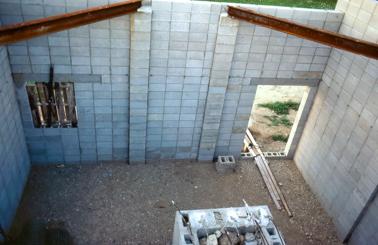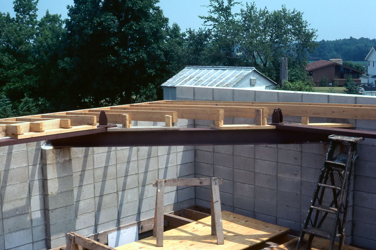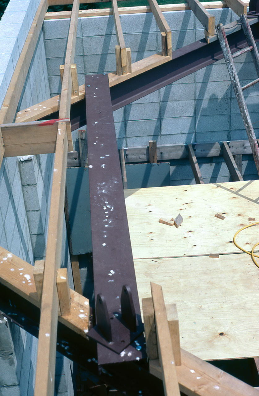 Jun 28 The first two of the four I-Beams were lifted onto the pilasters, about 14 feet from the ground. This will be one of the most dangerous jobs of the entire project. The sensible course would have been to rent a crane to lift the beams as they were incredibly heavy, but the cost would be prohibitive since there was very little money for the project in the first place. Gerry Samolyk hatched a plan to use scaffolding and cinder blocks so a minimum of 4 people would lift the beam the height of one cinder block. This would continue for a couple of blocks until the next rung of the boards could be inserted.