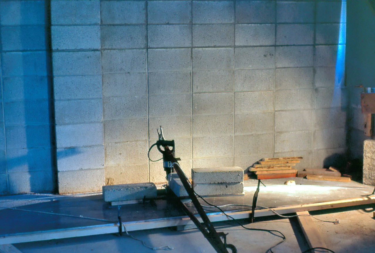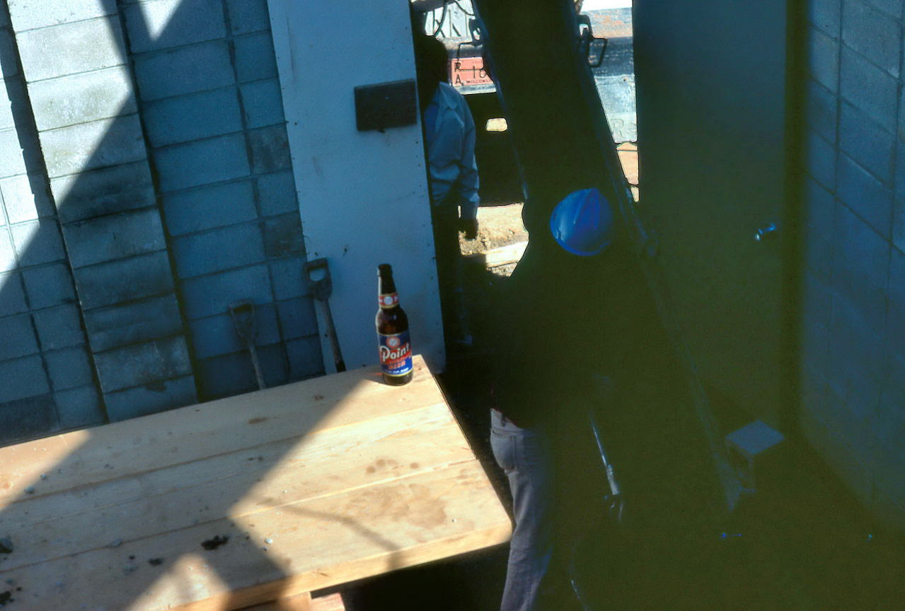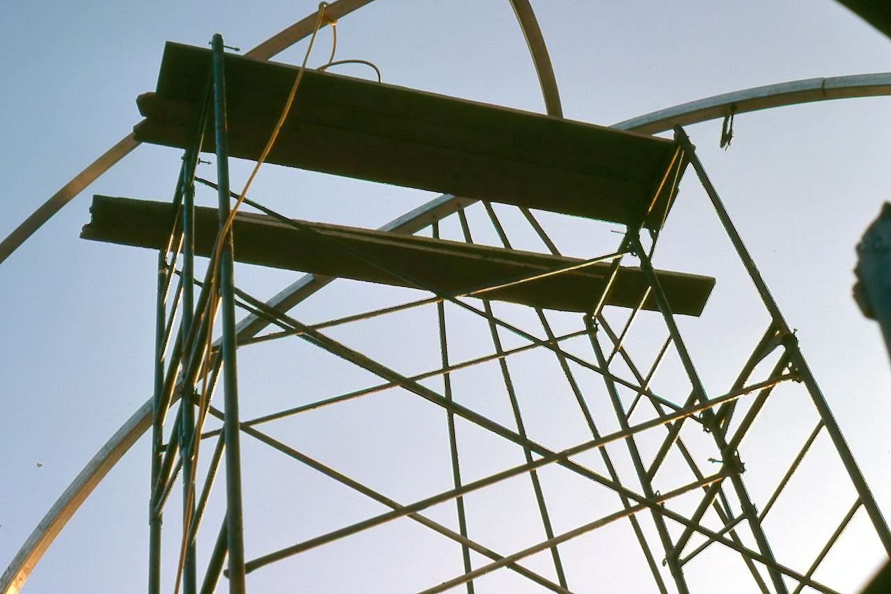 Jun 28 The first two of the four I-Beams were lifted onto the pilasters, about 14 feet from the ground. This will be one of the most dangerous jobs of the entire project. The sensible course would have been to rent a crane to lift the beams as they were incredibly heavy, but the cost would be prohibitive since there was very little money for the project in the first place. Gerry Samolyk hatched a plan to use scaffolding and cinder blocks so a minimum of 4 people would lift the beam the height of one cinder block. This would continue for a couple of blocks until the next rung of the boards could be inserted.