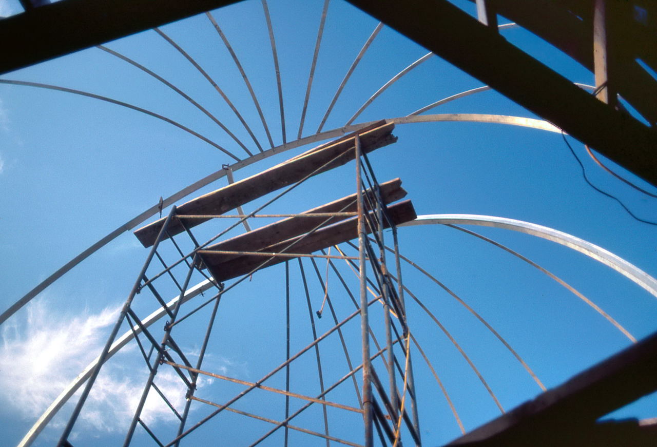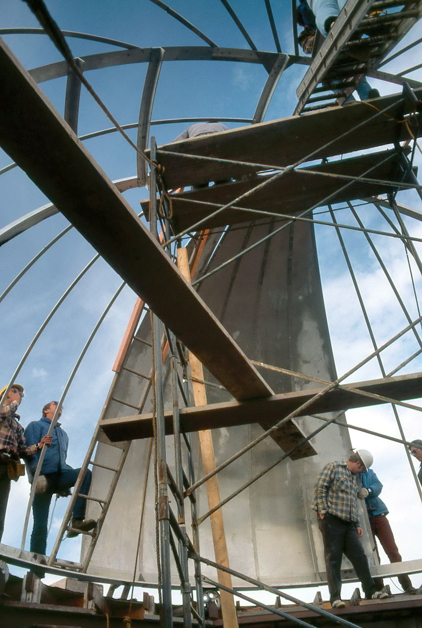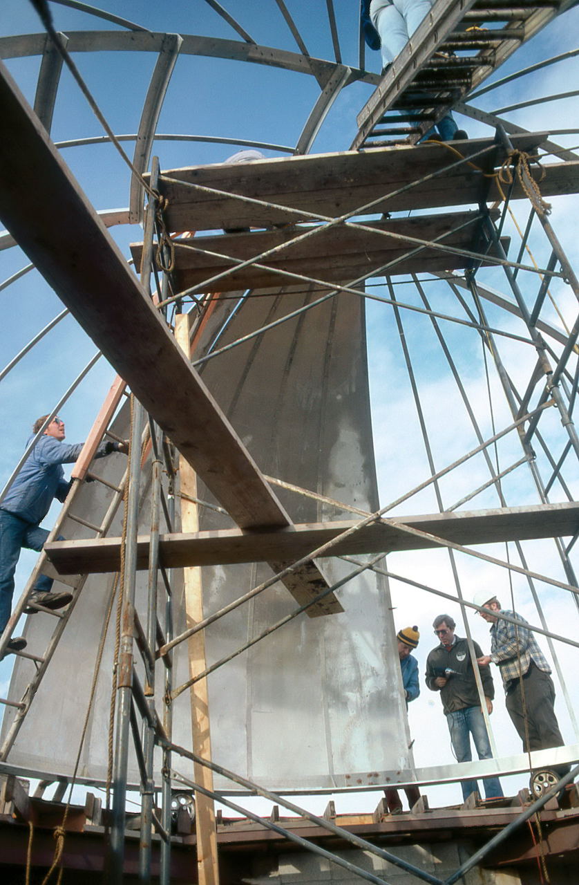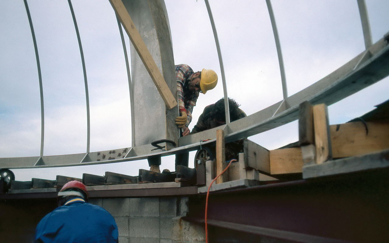 Finally, Samolyk was not going to have the luxury of building the dome in a nice climate controlled (and especially wind controlled) warehouse. We could make the pieces of the dome on terra firma, but all of the assembly would have to done in place. Though Bill Albrecht claimed he sneakily designed the Delco dome in 3 pieces so it would be moved one day to the MAS, the fact was that it was being built in a warehouse in downtown Milwaukee and then had to be transported to Oak Creek.