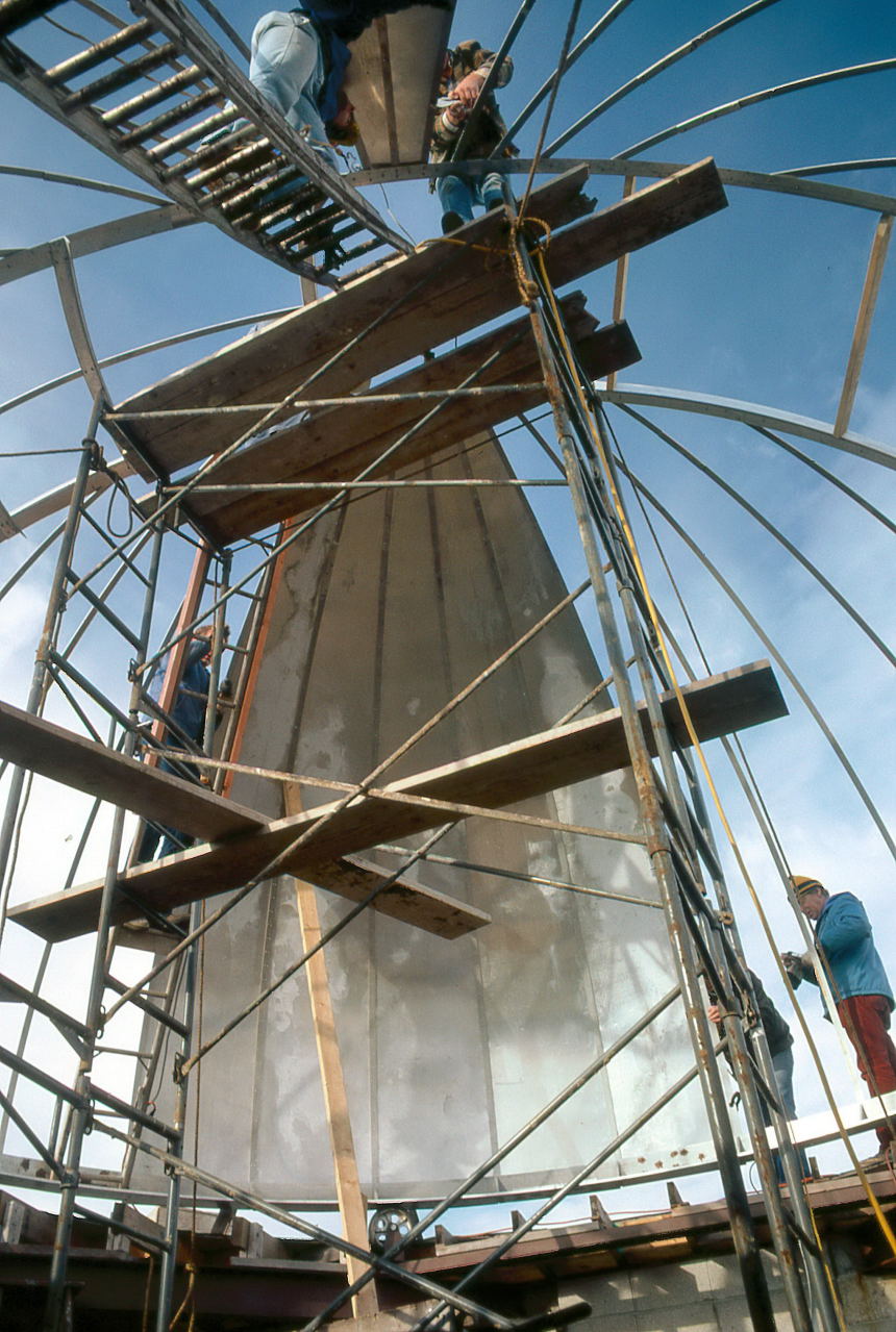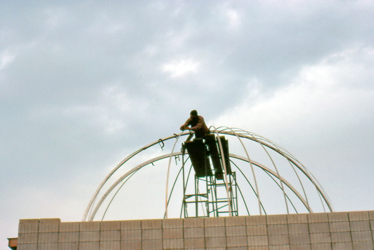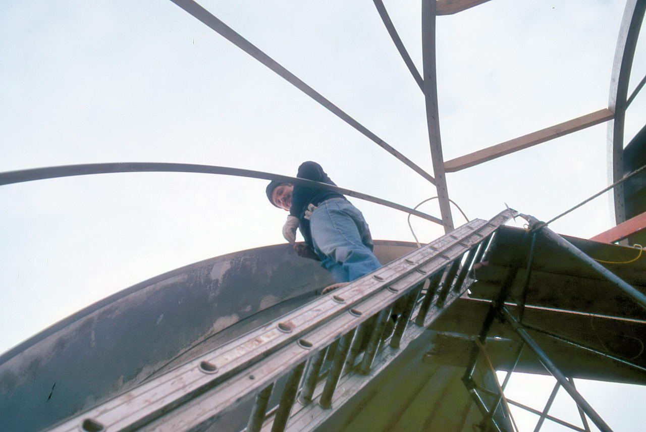 Finally, Samolyk was not going to have the luxury of building the dome in a nice climate controlled (and especially wind controlled) warehouse. We could make the pieces of the dome on terra firma, but all of the assembly would have to done in place. Though Bill Albrecht claimed he sneakily designed the Delco dome in 3 pieces so it would be moved one day to the MAS, the fact was that it was being built in a warehouse in downtown Milwaukee and then had to be transported to Oak Creek.